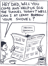(18 December 1997, Malaysia) Four teenage boys spent months industriously digging tunnels in a river bank, planning to use them as trenches in an imaginary war game. Three of them were killed at noon today when one of the tunnels caved in on them. One boy, Mohd Suhaimi Saad, 12, was rescued from the tunnel 15 minutes after the incident. Residents of Kampung Bendang Tok Teri took about an hour to pull out the bodies of the remaining three boys, Mohd Suhaimi Md Isa Haron, 18, Mahadir Ahmad, 17, and Nik Kamaruddin Razak, 12.