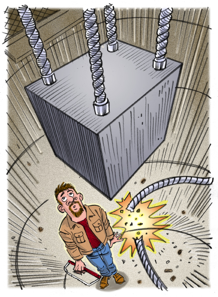 The silo housed a grain elevator. Its massive cable was tightly tethered to the floor and its upper end disappeared into the shadowy space above. After substantial wear and tear on a hacksaw, our man cut through the bottom end of the strong steel cable! At that instant...